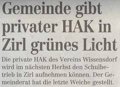 Die Private Handelsakademie WISSENSDORF startet im Schuljahr 2010/2011 im Schulzentrum Zirl. Das beschloss der Gemeinderat am 18.11.2009 einstimmig und bekannte sich somit eindrucksvoll zum Projekt WISSENSDORF.